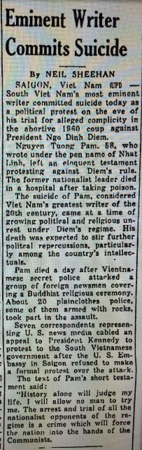 “South Viet Nam Eminent Writer Commits Suicide” by Neil Sheehan, “South Viet Nam’s most eminent writer committed suicide today as a political protest on the eve of his trial for alledged complicity in the abortive 1960 coup against President Ngo Dinh Diem. Nguyen Tuong Tam [mispelled Pam by Sheehan] 58, who wrote under the pen name of Nhat Linh, left an eloquent testament protesting against Diem’s rule. The former nationalist leader died in a hospital after taking poison. The suicide of Tam, considered Viet Nam’s greatest writer of the 20th century, came at a time of growing political and religious unrest under Diem’s regime. His death was expected to stir further political repercussions, particularly among the country’s intellectuals… The text of Tam’s short testament said: “History alone will judge my life. I will allow no man to try me. The arrest and trial of all the nationalist opponents of the regime is a crime which will force the nation into the hands of the communists.” UPI 7/8/1963