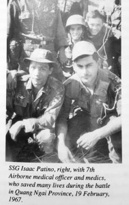 Hình 2: Y sĩ Trung Uý Mũ Đỏ Đoàn Văn Bá, YST Tiểu Đoàn 7 Nhảy Dù & Trung sĩ Isaac Patino cùng các Y tá ND đã cứu được nhiều mạng sống trong cuộc giao tranh ngày 19.02.1967 tại Quảng Ngãi (trái). Chuẩn Tướng Roberts trao bằng tưởng thưởng cho Y sĩ Trung Uý Đoàn Văn Bá do công trạng cứu sống các binh sĩ TQLC Mỹ trong Trận đánh Tết Mậu Thân 1968 ở Huế (phải). (1)
