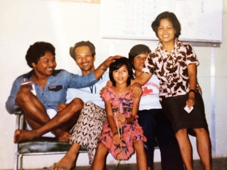 Hình 4: Thuyền nhân Đoàn Văn Bá và con gái nhỏ tên Trang trên đảo tỵ nạn Galang, Indonesia. Bá mặc Sarong chân đi dép quai, da đen tóc quăn trông không khác một thổ dân trên đảo. Anh là giám đốc bệnh xá của Hội Hồng Thập Tự thuộc văn phòng Cao uỷ Tỵ nạn Liên Hiệp Quốc / UNHCR, hết lòng chăm sóc cho dân tỵ nạn đổ tới ngày càng đông tới đảo từ ngày Bá đặt chân tới đây cho tới khi Anh rời đảo Galang để đi định cư tại Hoa Kỳ. [Hình từ album gia đình Chị Đoàn Văn Bá]