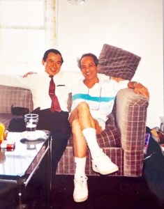 Hình 10: Nụ cười rạng rỡ của Mũ Đỏ Đoàn Văn Bá (phải) và Mũ Xanh Ngô Thế Vinh khi gặp lại nhau ở Brooklyn, New York 1989 giữa những tháng ngày còn “đèn sách” (trái); Bìa sách TT YSTT Nghiêm Sỹ Tuấn, Người Đi Tìm Mùa Xuân (phải). [tư liệu Ngô Thế Vinh]