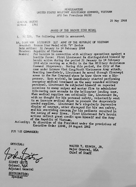 Lieutenant Ba’s singularly impressive display of courage, utterly disregard for his own safety, and his overriding concern for his patients resulted in the saving of many lives. First Lieutenant Ba’s heroic actions reflect great credit upon himself and the Army of the Republic of Vietnam.