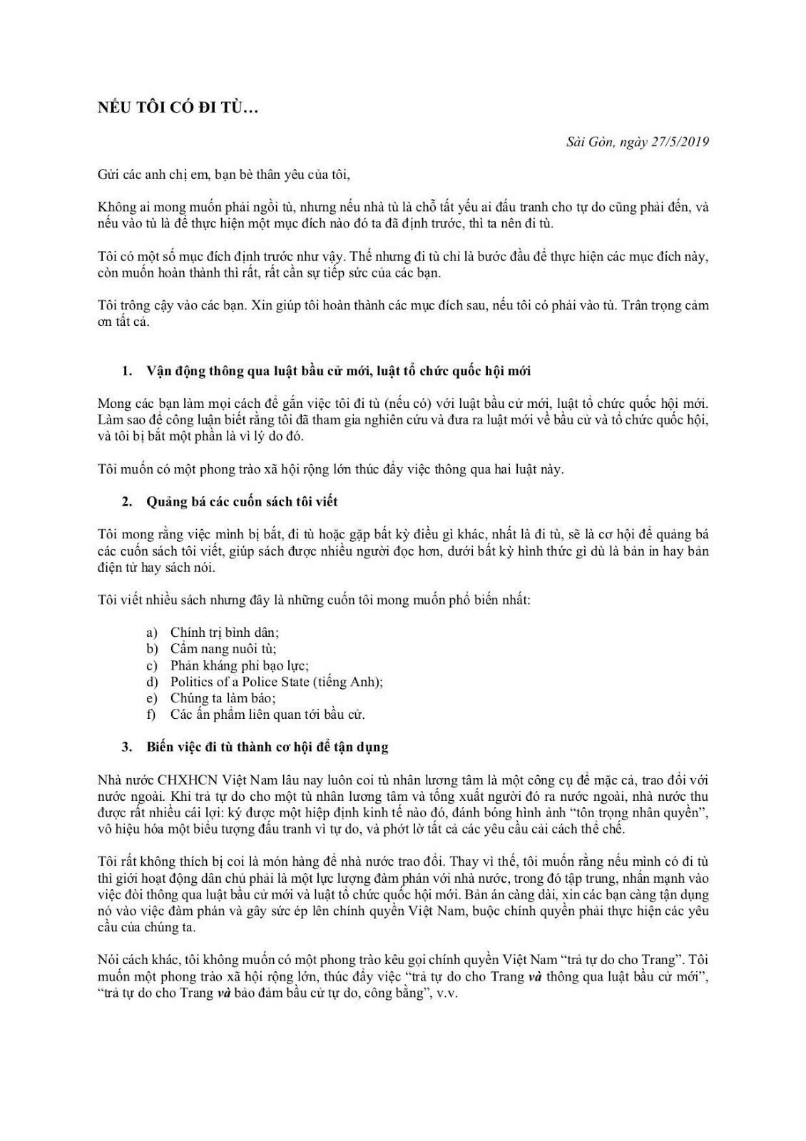 7. Nếu có vận động để trả tự do cho tôi, xin các bạn bắt đầu từ khoảng năm thứ 3 hoặc thứ 4 (tính từ thời điểm bị bắt), và xin hết sức lưu ý gắn mọi chiến dịch vận động với việc thực hiện các mục đích tôi đã nếu trên. Kịch bản lý tưởng là tôi được trả tự do mà vẫn ở Việt Nam (không bị tống xuất ra nước ngoài) và những mục đích tôi đề ra đều được hoàn thành.