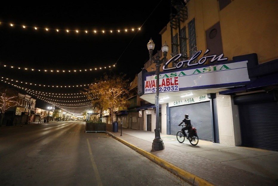 Police officer on a bike patrols an empty downtown in El Paso – Mario Tama / Getty Images