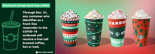 Họ có thể uống cà phê miễn phí không hạn chế suốt tháng 12 năm nay. Chỉ cần đưa thẻ nhân viên chứng tỏ mình là “nhân viên tuyến đầu”, để nhận “lời cảm ơn ấm áp” cả hai nghĩa từ Starbucks