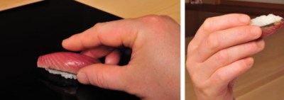 Ví dụ. Ăn sushi nên dùng đũa với các cuộn cơm, và dùng ngón tay với cục cơm phủ miếng cá: đặt ngón trỏ ở đầu miếng, ngón cái và ngón giữa ở 2 bên cạnh, nhấc lật ngửa miếng sushi, nhúng đầu kia của miếng cá vào nước chấm và đưa ngửa đầu đó vào lưỡi trước.