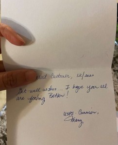Cuối tuần lễ cách ly đầu tiên, cả Lisette và cậu con trai lớn rất mệt, gallon sữa đã dốc đến giọt cuối cùng, cả ba mẹ con đều cần thêm thuốc hạ cơn sốt. Như một phép màu, khi mở cửa để lấy thư vào buổi trưa, Lisette thấy một túi thực phẩm gồm những thứ mà gia đình bà đang cần : sữa, nước cam tươi, bánh crackers, bánh cookies…