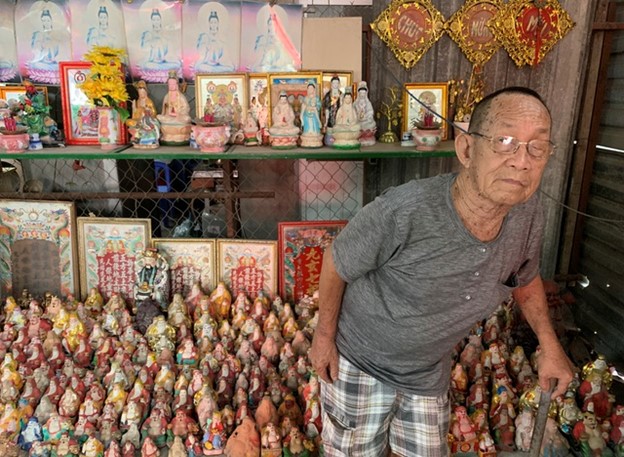 Tới khu vực chợ Thủ Đức, hỏi nhà “ông Hai thờ ông Địa” là dân địa phương sẽ tận tình chỉ dẫn liền. Năm nay đã 87 tuổi nhưng ông vẫn còn minh mẫn kể lại cơ duyên đưa ông tới với tượng các vị thần: “Trước đây Thủ Đức chỉ là một huyện xa thành phố nên xung quanh nhà tôi toàn cánh đồng hoang vắng Tới năm 1997, sau khi quy hoạch, nhà tôi nằm trên mặt đường vị trí đẹp. Gần đây có người trả giá lô đất hơn trăm tỷ nhưng tôi không bán mà để dành làm nơi thờ cúng các bức tượng bị bỏ”. Khoảng ba chục năm trước, ông Hai làm nghề chạy xe ba gác. Tình cờ vào một buổi chiều, khi chạy xe về nhà, ông thấy một tượng Bà Chúa Xứ bị sứt mẻ đặt ở trước cửa nhà nên ông mang vào, lấy xi-măng sửa lại để thờ. Sau đó, mỗi sáng, ông thấy trước cửa nhà đầy những tượng cũ kỹ hoặc sứt mẻ người ta mang đến, ông đều mang vào sửa sang lại, đặt lên bàn thờ. Hiện ông đã có trên một ngàn tượng, phần lớn là tượng ông Địa. Khu đất rộng hai ngàn thước vuông của ông Hai là một gia tài nhiều người mơ ước. Ông cương quyết: “Mảnh đất này người ta đã từng trả 110 tỷ đồng (4 triệu 730 ngàn đô Mỹ) nhưng tôi không bao giờ bán. Sau này nếu tôi mất, tôi sẽ để lại cho các con và chúng sẽ tiếp tục thu nhặt, thờ cúng các tượng Phật và ông Địa này”.