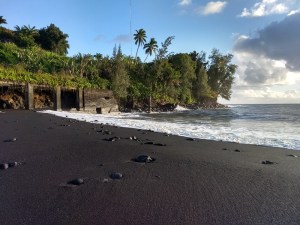 Sáng nay, một vài thanh niên trẻ theo sau chúng tôi xuống bãi. Hai thân già ngừng lại để họ qua mặt. Nhìn những bàn chân thoăn thoắt trong những đôi dép cao su mà tôi thấy phục trong lòng. Mình đã đi giầy Ba-ta mà còn chăm chú lê từng bước một, vì chỉ cần vô ý giẫm lên một quả kukui (cây đèn cầy) hay quả macadamia thì chiếc giầy sẽ coi như là được gắn thêm bánh xe mà không có thắng. Sau một đoạn đường vòng vo dưới các lùm cây kukui và macadamia và vài loại cây không tên khác, chúng tôi quẹo vào một con đường mòn chạy dọc theo con suối nhỏ dẫn ra biển. Cả ba tháng nay trời mưa liên tiếp, nước đã theo đồi theo núi đổ xuống ào ào, nâng mực nước lên cao như một dòng sông. Chúng tôi men theo con đường mòn trơn trượt phủ nhiều lá sũng ướt. Trên lớp bùn đất một vết trượt chân của ai đó để lại, có lẽ trước đó không lâu. Chỉ trong chốc lát bờ biển hiện ra trước mặt. Mấy thanh niên qua mặt chúng tôi lúc nẫy đang bơi ra xa trên tấm ván trượt nước của họ.