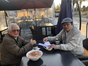 GS Nguyễn Văn Sâm (trái) đón sinh nhật thứ 81 nơi một quán
