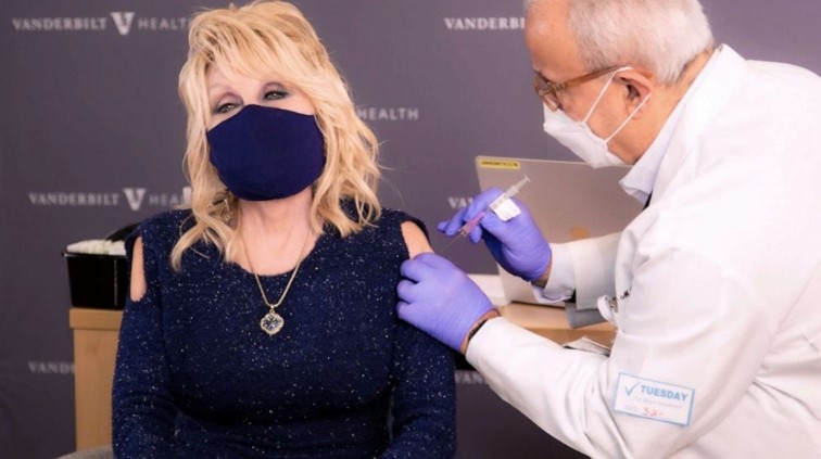 Thế mà, Dolly Parton vẫn kiên nhẫn xếp hàng, và vừa được chích ngừa trung tuần tháng giêng năm nay vì đã bước vào tuổi 75. Bà được chích thuốc Moderna ở Vanderbilt University Medical Center bởi chính người bạn thân của mình, bác sĩ Naji Abumrad.