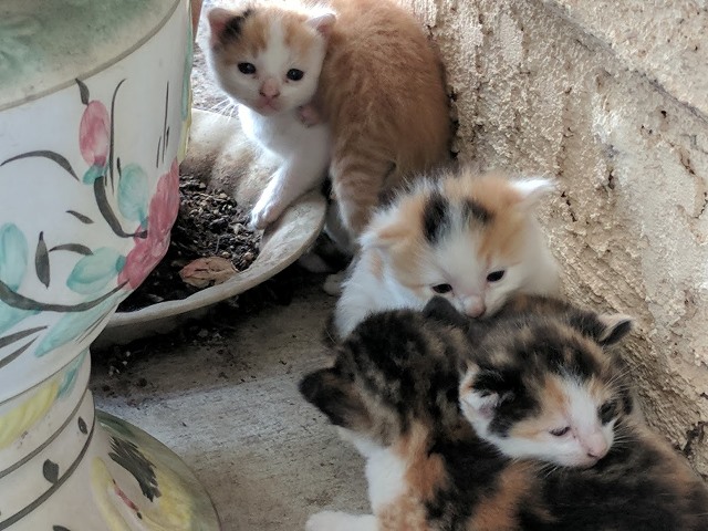 Từ mấy tháng nay vài con mèo không biết từ đâu tới, tự nhiên chiếm cứ những gầm xe ngoài bãi đậu xe trong dãy chung cư gồm 10 căn, nơi tôi đang ở. Thấy tội nghiệp mấy chị Việt Nam thay phiên nhau cho ăn, kết cục mấy tháng sau tự nhiên thấy lòi ra thêm mấy trự nữa dáng vóc nhỏ hơn nhiều, chắc là con của tụi nó. Với màu lông giống hẳn nhau, vài đóm vàng cam rãi rát trên đám lông trắng ngần là một thứ DNA rõ ràng nhất . Chính màu lông này tạo nên vẻ sang trọng cho gia đình mèo này, một loại áo choàng lông mặc cả bốn mùa. Có lẽ đây cũng là điểm son để thu hút mấy chị.