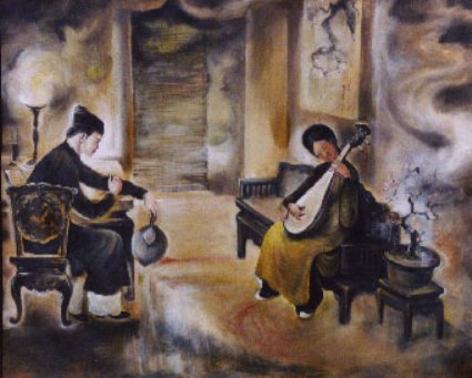 Sương mai bảng lảng, bên mái hiên lợp tranh vàng một nàng thiếu nữ chừng mười sáu mười bảy tuổi đang ngồi thông tâm sen. Thi thoảng gió khuẩy trêu mái tóc, nàng khẽ đưa tay vén, môi hé cười, quả là vẻ đẹp mê hồn đắm nguyệt khiến cho những đóa hoa cũng không dám bung hết sắc hương.